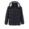 Moose Knuckles Black Hooded Padded Jacket. Front zip fastening with covered buttons, two side zip pockets, adjustable and removable hood with contrasting silver detailing on the inside. Silver interior, zip pocket. Logo patch on the sleeve. Composition: 74% Nylon, 26% Cotton