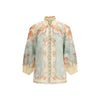 The long-sleeved Blouse by Zimmermann embodies delicate, feminine elegance. Crafted from lightweight ramie, it features a high neckline with scalloped detailing and rouleau buttons running down the centre front, adding a refined, tailored touch. Long sleeves with elasticated cuffs complete the design, which is designed for a relaxed fit. A placement print enhances the piece, while the lightweight, non-stretch fabric ensures an airy, natural drape.