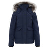 Moose Knuckles Blue Hooded Field Jacket with Fur. Made of technical fabric, padded interior, front fastening with a covered zip and buttons, two front flap pockets and two side pockets. High collar with exposed buttons, adjustable and removable hood with fur trim. Lining and pockets. Logo applique on the sleeve.