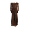 The georgette off shoulder maxi Dress by Self-Portrait captures a light, carefree spirit with an effortless boho allure. Crafted in brown crinkle georgette, it flows softly over the silhouette, enhanced by a romantic off-shoulder neckline and delicate ruffle detailing. The elasticated waistband gently defines the figure, while the knee-length lining ensures comfort and ease. Perfect styled with flat sandals, it’s an ideal choice for relaxed days and beachside evenings.